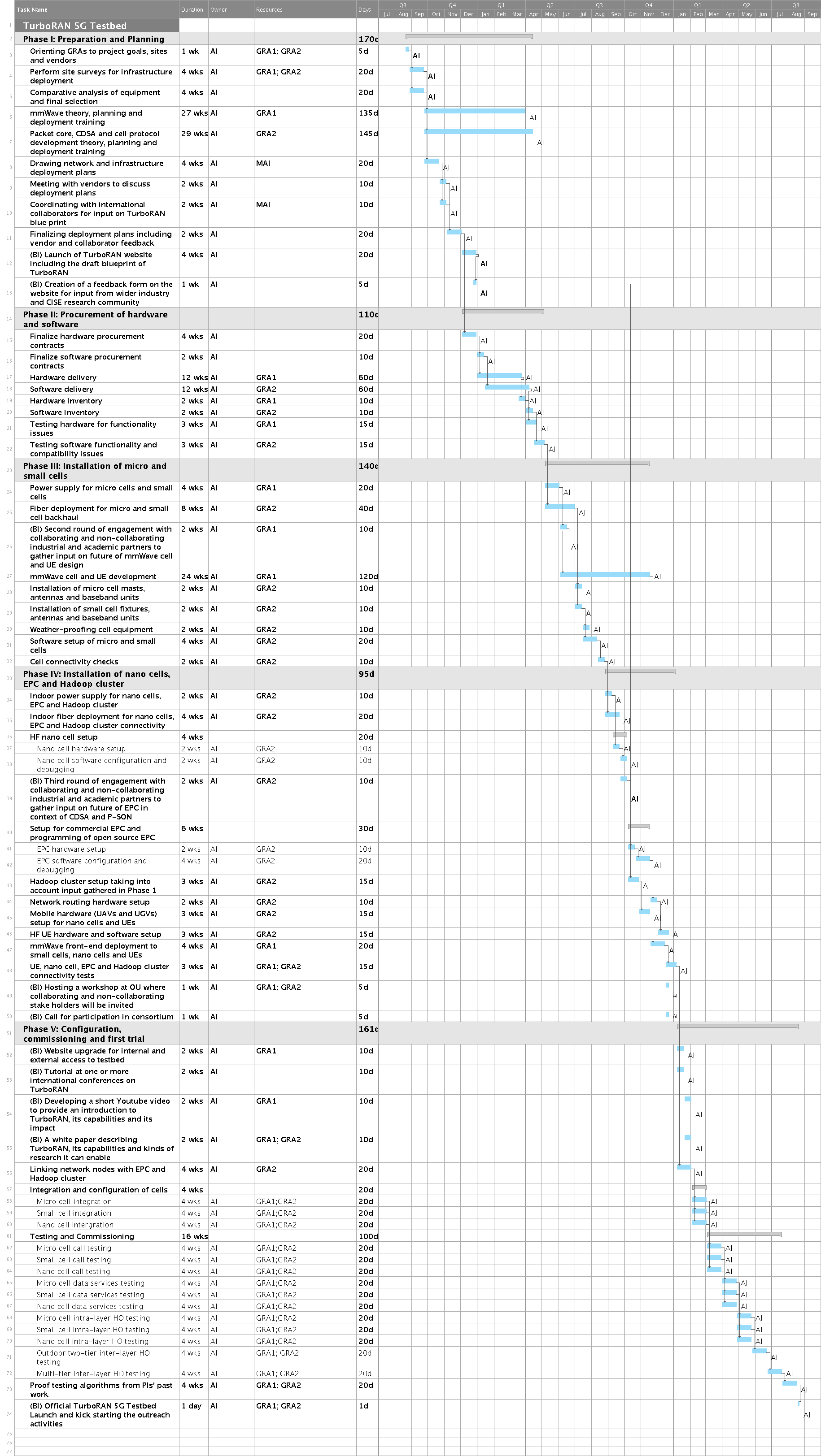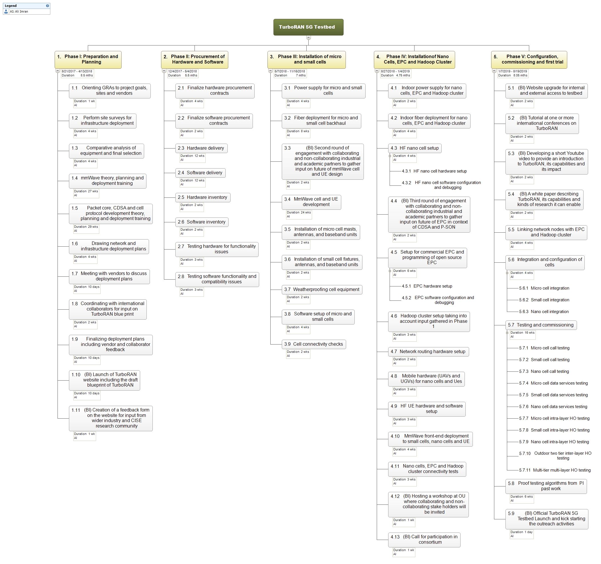 TurboRAN project will be completed in 5 phases, as illustrated in attached WBS. The description of each phase and activities therein and deliverables and broader impacts (BIs) associated with these activities are identified below.